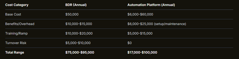 This scenario plays out in countless businesses every year. Hiring a single BDR can cost between $83,000-$213,000 annually when you factor in all hidden expenses. Meanwhile, sales automation platforms promise efficiency gains but carry their own substantial implementation and maintenance costs that many businesses drastically underestimate.