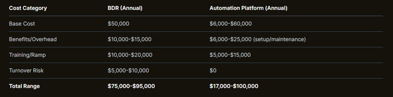 BDR cost calculations should include base salary plus 25-35% for benefits, training investments, ramp period productivity losses, and estimated turnover risks. Total cost of ownership calculations provide more accurate comparisons between human and automated approaches.