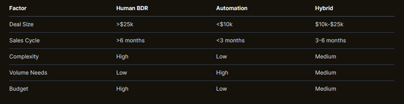 What's the break-even point between BDR costs and automation investment? The break-even typically occurs when deal sizes exceed $15-25k with sales cycles longer than 4-6 months, or when outreach volume exceeds 500+ prospects monthly. Below these thresholds, automation usually delivers superior ROI. Above them, human relationship-building capabilities often justify the additional investment.
