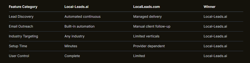 When comparing core capabilities side-by-side, Local-Leads.ai consistently delivers superior functionality across every critical category. The differences aren't marginal; they're substantial enough to determine platform viability for most businesses.