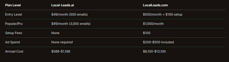 - Cost Advantage: Local-Leads.ai costs 90% less than LocalLeads.com with plans starting at $49/month vs $500-$1,000+