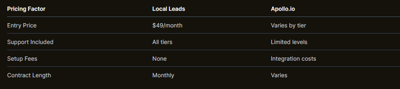 Q: How does pricing compare between the two platforms? A: Local Leads starts at $49/month with full functionality and dedicated support included. Apollo's complex pricing structure often requires higher investment for meaningful features, making Local Leads more cost-effective for focused lead generation.
